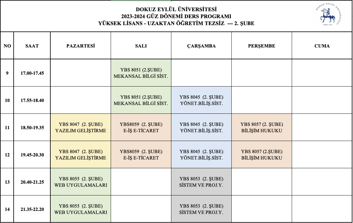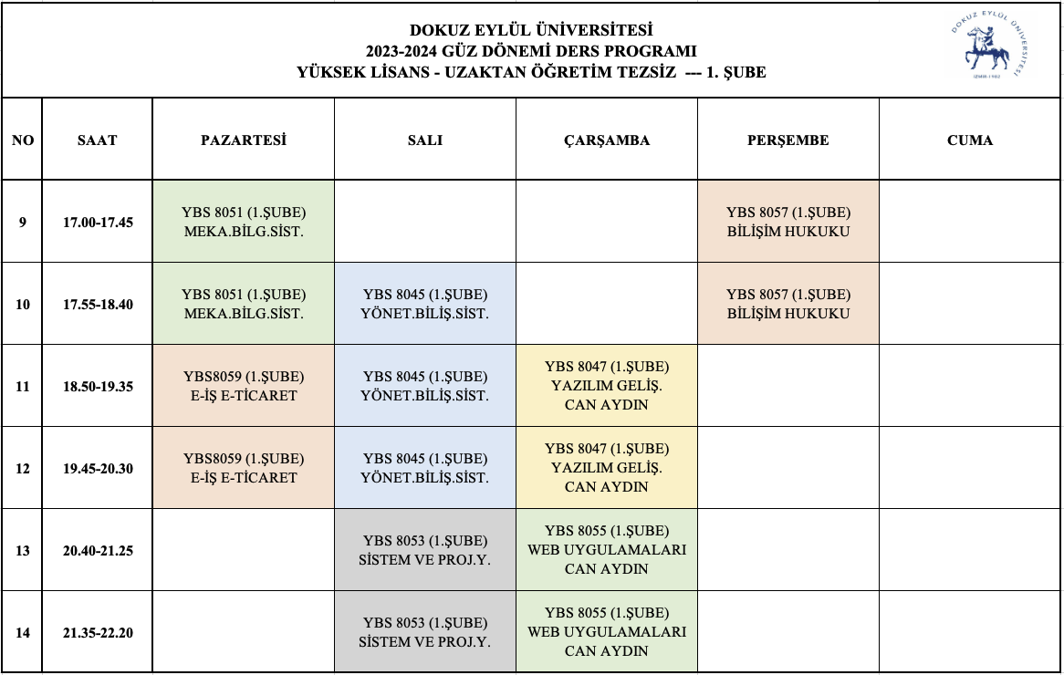 DEÜ YBS 2023-2024 Güz Dönemi Yüksek Lisans ve Doktora Ders Programları